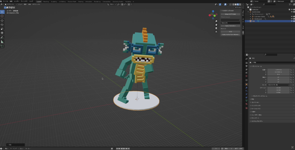 VoxEditから、gltf形式で書き出し、Blenderで読み込みます。
