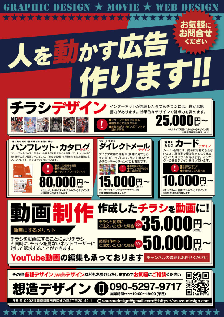GRAPHIC DESIGN グラフィックデザイン 折込チラシから、ポスター、名刺、パンフレットなど様々な販促物を制作しています。それぞれのお客様に合わせたデザインから、他にはない、ユニークなデザインをご提案することが可能です。 WEB DESIGN VIDEO PRODUCTION